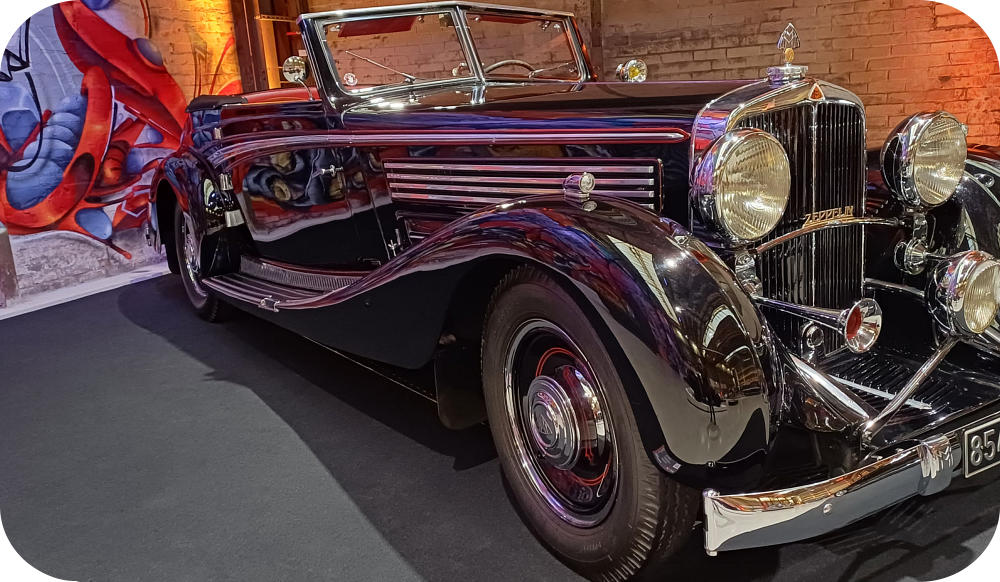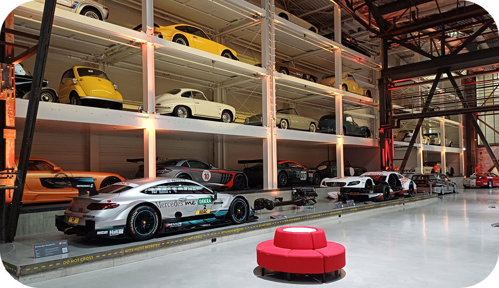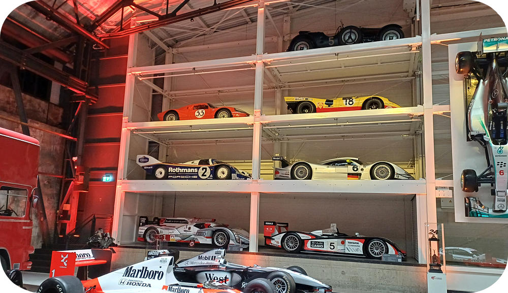 Auf einer über 7000m² großen Fläche kann sich jeder Besucher in die Geschichte des Automobils seit den Anfängen hinein träumen, Darstellungen und Schaukästen, einer Motorengalerie sowie anhand von Schnittmodellen wird die Entstehung und Entwicklung anschaulich erklärt. Auf einer Steilkurve in der großen Halle ist die Entwicklung des Autos in greifbarer Nähe - sichtbar. Dahinter sind in einem übergroßen Setzkasten 30 Sport, Tourenwagen, Rally - und Rennwagen großzügig zu sehen. Insgesamt sind dort ca . 50 Hersteller vertreten, was selbstverständlich - wer meinen ex. Chef kennt -nicht das Ende sein muss und darf.(Danke) . Auch das es zur Zeit etwa 150 Wagen versch. Sparten, Zeitregionen und Hersteller sind, besagt noch nicht das Ende.