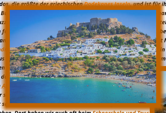 Rhodos, die größte der griechischen Dodekanes Inseln,und ist für ihre Strandorte, antiken Ruinen und Bauwerke aus der Zeit der Besatzung durch die Ritter des Johanniter Ordens während der Kreuzzüge bekannt. Die Altstadt von Rhodos-Stadt ist von der mittelalterlichen Ritterstraßeund dem festungsartigen Großmeisterpalast geprägt. Nach seiner Eroberung durch die Osmanen und der anschließenden italienischen Besatzung beherbergt der Palast heute ein historisches Museum, am MandrakiHafenmachen Schiffe aus aller Welt fest. Es ist auch kein Wunder Rhodos Stadt von ist auch vom Meeraus eine sehr imposant Erhebung. In Rhodos Stadt selbst sollte man in den engen Gassen und Passagen am besten gegen Abend/ Nacht gehen, wenn die Sonne untergegangen ist dann erhebt sich in Rhodos das Leben. Am Rande von Rhodos liegt gut versteckt unter uralten Bäumen versteckt der Rodini Park. In Archangelos (ins Deutsche übersetzt heißt es die = unsichtbare) sollte man nicht vergessen, eine der schönsten Buchten auf Rhodos zu besuchen Die Stegna Beach sie präsentiert sich bei der Anfahrt schon als wunderschönes Fleckchen Erde, für alle die entspannt Sonne und Meer lieben. Dort haben wir auch oft beim Schnorcheln und Tauchen manch schönen Meeresbewohner bewundern können. In Lindos gibt es etwas dass es sonst auf der ganzen Insel nicht mehr gibt, in die Innenstadt ist es leider nicht möglich mit einem Auto zu fahren Zu dicht, zu eng, zu steil sind dort die Gassen- da auch dort es sehr sehr viele Souvienier- Shops sind wirkt das Städtchen Lindo`s mit seinen schneeweisen Häusern noch viel enger. Hoch oben präsentiert sich die Akropolis von Lindos. Auch wenn es eine lange Strecke ist, sollte man es sich nicht nehmen lassen die Südspitze von Rhodos zu besuchen, sofern es das Meer zulässt sollte man die Engstelle überqueren und den Leuchtturm besuchen. Die Aussicht von dort ist phänomenal, genauso ist auch die Aussicht von Rhodos Stadt (Akropolis von Rhodos) auf die Nordspitze von Rhodos denn dort treffen zwei Meere aufeinander. Wer Land und Leute auf Rhodos kennen lernen möchte, und auch eine etwas längere Tour auf der Insel nicht schreckt dem möchte ich das Bergdorf Embona auf Rhodos empfehlen. Dort ist die Zeit stehen geblieben einheimische treffen sich bei Brot und Wein und manch einem Stückchen gegrilltem zu Gesprächen, lachen und feiern. Am Strand von Koustik Beach ist das baden relaxen Rhodos in seiner schönsten Form zu erleben, glasklares Wasser und wunderschöne sanfte Wellen Laden zum Leben ein, ganz besonders sagt dort die Sonne gute Nacht. Ja es ist etwas zu fahren, aber es lohnt in jedem Fall. Epta Piges oder auch das Tal der sieben Quellen ist ein wunderschöner Ort an dem sich sieben Quellen in einem kleinen Fluss treffen, auch bei knalligen Sonnenschein ist es dort sehr schattig und feucht und gut auszuhalten. Lust auf Schmetterlinge...Butterflies Valley Park noch nie im Leben habe ich eine solche Milliarden große Ansammlung von Schmetterlingen gesehen. Es ist ein Wahnsinn, dieses kleine Tal muss etwas ganz besonderes haben das sich eine solche Menge an Schmetterlingen dort ein findet. Aber zurück an die Nordwestküste von Rhodos .... Filerimos Cross und sein gewaltiges Kreuzist immer wieder den Weg hinauf auf dem Berg wert, auch die dortigen Klöster werden jedes viel etliche Trauungen, und weiteres benutzt.Der Ausblick auf die Nordwestküste ist einfach nur phänomenal. Wer eher das baden Schnorcheln oder auch tauchen liebt, dem empfehle ich ganz besonders der Kallithea Strand / Thermen in der Nähe von Rhodos empfohlen aber auch der Weg hinab in die Stegna Beach bleib nicht ohne bleibende Folgen.. Diese sind selbstverständlich nur kleine Auswahl und nur wenige Empfehlungen um auf Rhodos seinen Urlaub zu verbringen, aber es sind wunderschöne Erlebnisse die man dort mit nach Hause nimmt.